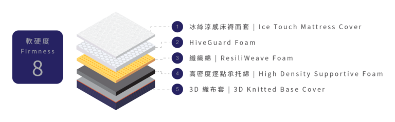 結合創新的HiveGuard技術和蜂巢式設計,提供卓越的承托力和減壓效果,同時吸收熱量、排濕,具抗菌防蟎特性。