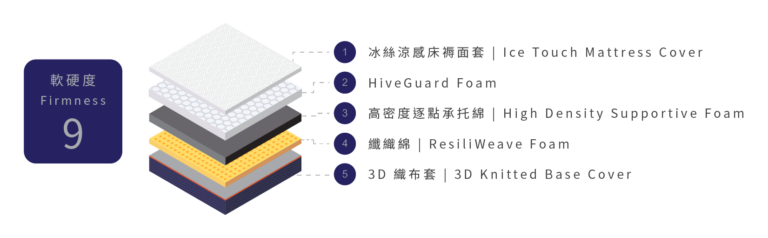第二代纖織棉(Hiveguard Foam)強力承托每一處身體部位,久睡依然挺實。蜂巢結構促進空氣流通與排濕,防菌防蟎,持久保持潔淨透氣的舒眠體驗。