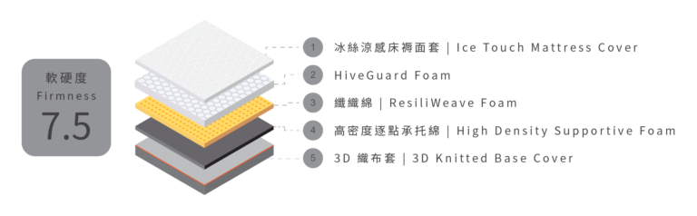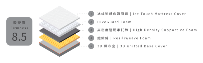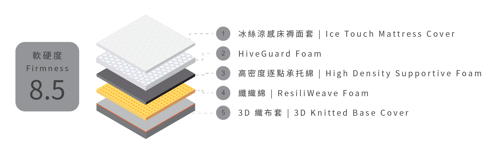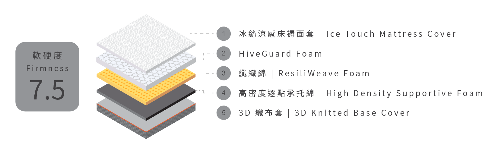 結合創新的HiveGuard技術和蜂巢式設計,提供卓越的承托力和減壓效果,同時吸收熱量、排濕,具抗菌防蟎特性。
